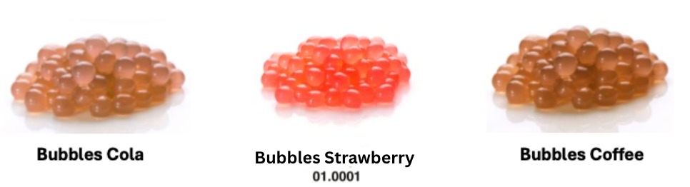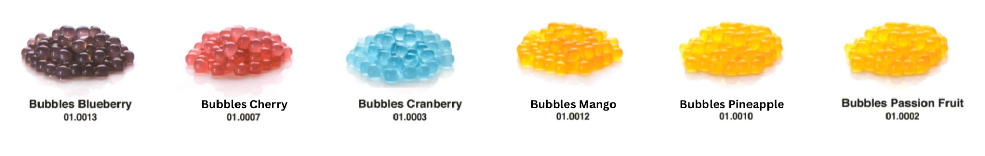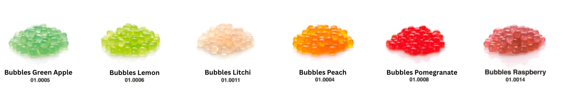 Bubbles, or otherwise popping boba, are small spheres with concentrated juice that burst in the mouth and are usually used in bubble tea. In contrast to traditional boba, which is based on tapioca, popping boba is made using the process of spherification. Popping boba has a thin surface that resembles gel with fruit juice inside. The ingredients for popping boba consist of water, sugar, fruit juice, and the necessary ingredients required for their spherification.